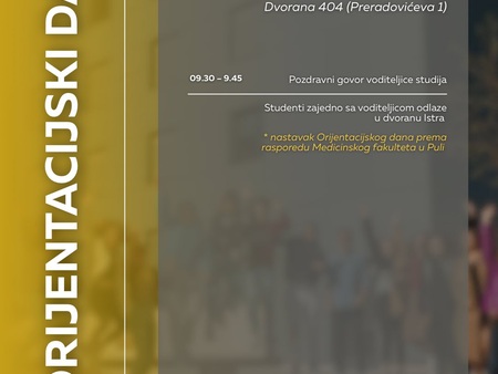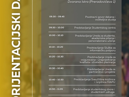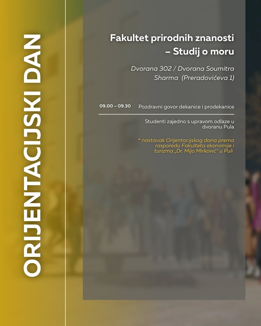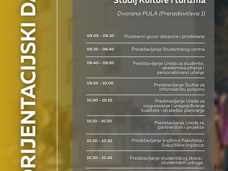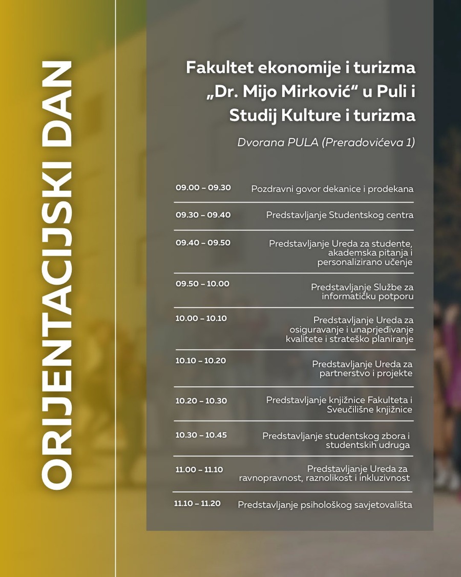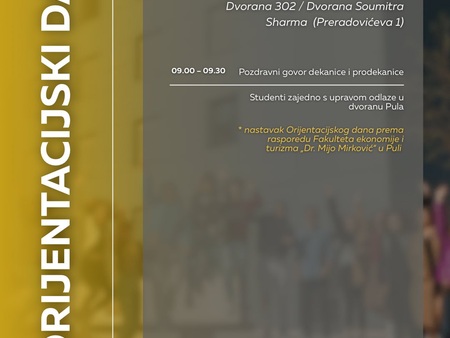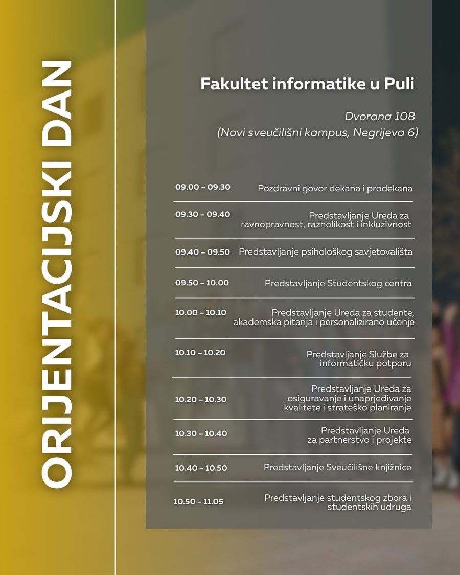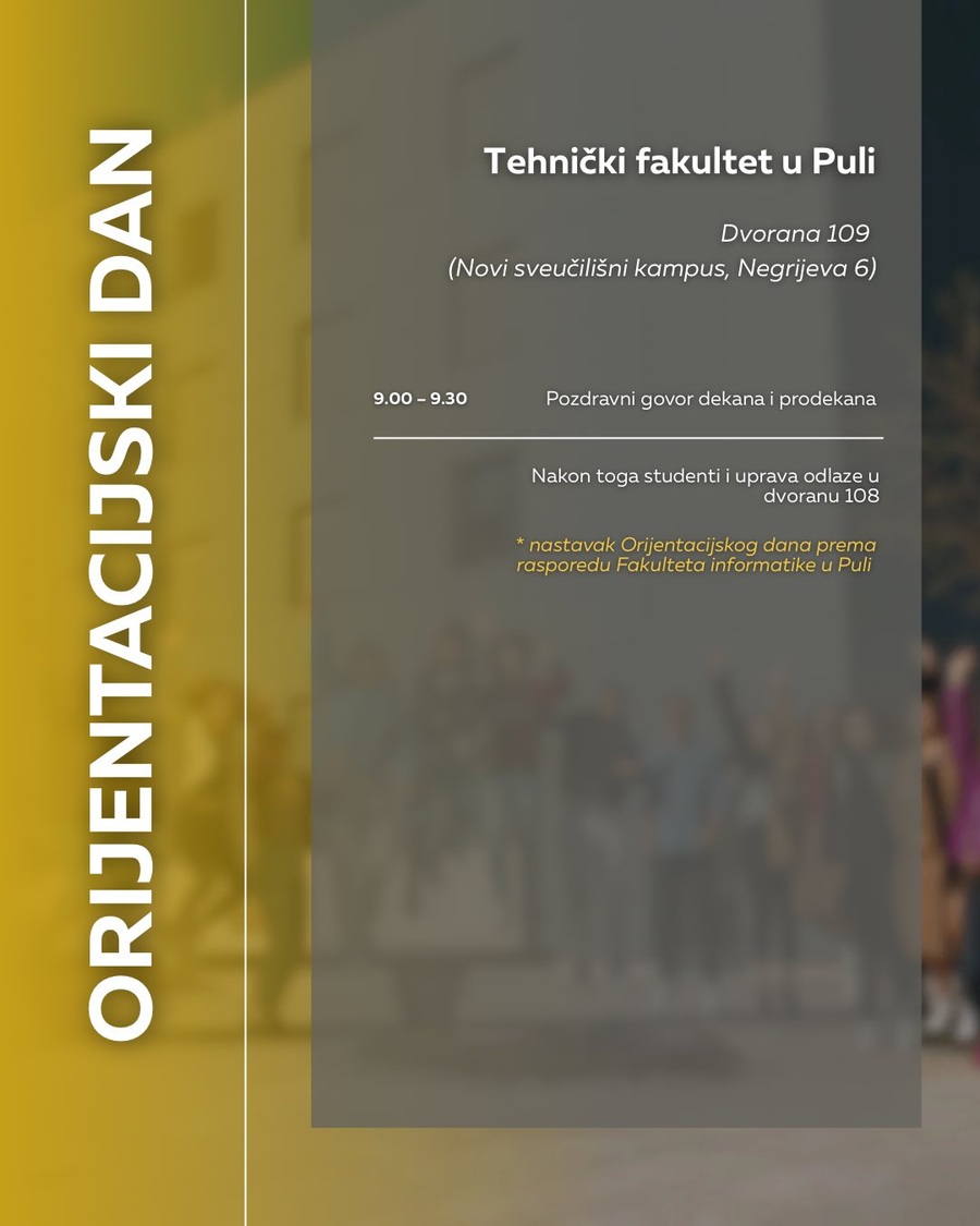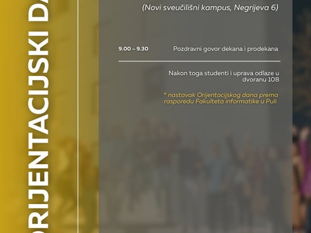 pozivamo vas na Orijentacijski dan Sveučilišta Jurja Dobrile u Puli u ponedjeljak, 6. listopada, koji će se održati na dvije lokacije: Preradovićeva 1 (zgrada FET-a) i Negrijeva 6 (sveučilišni kampus).
