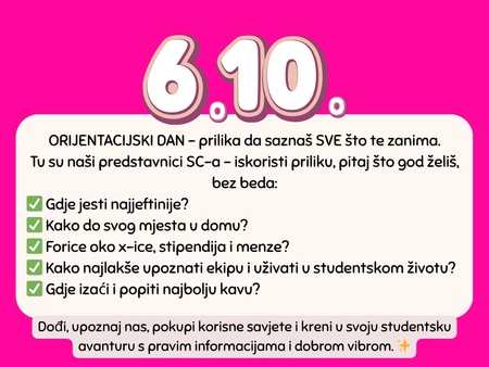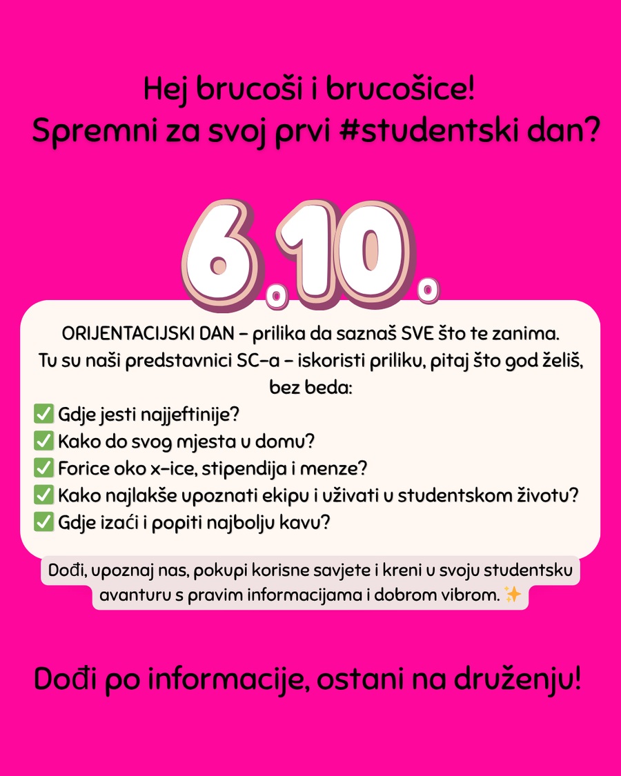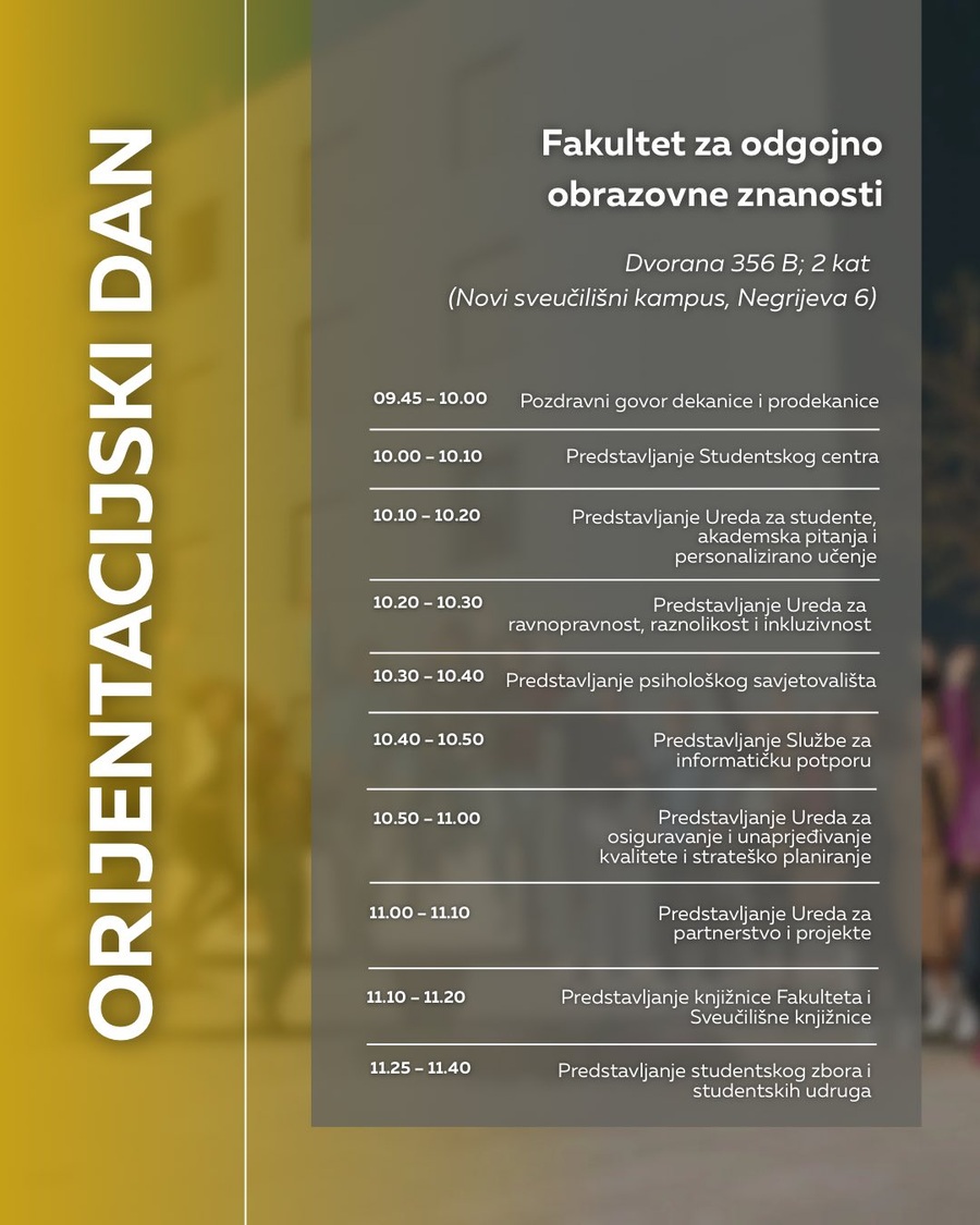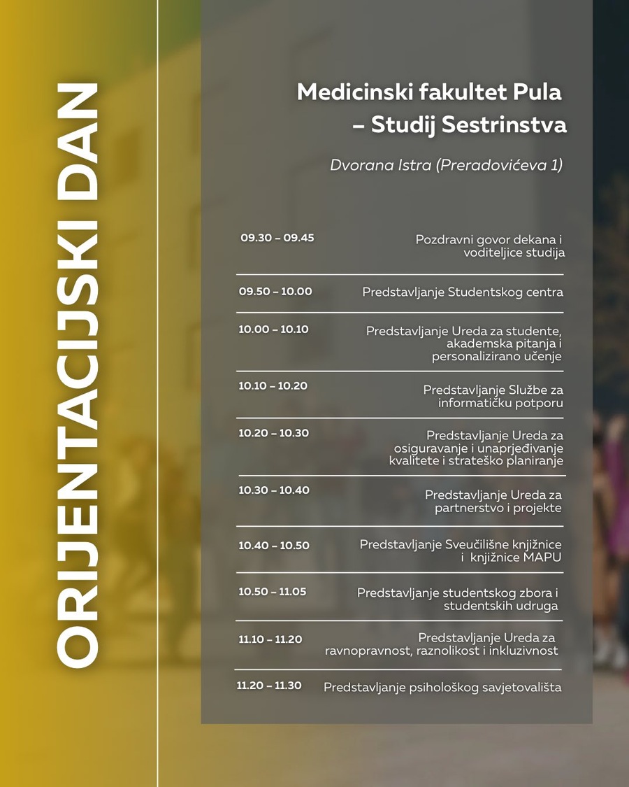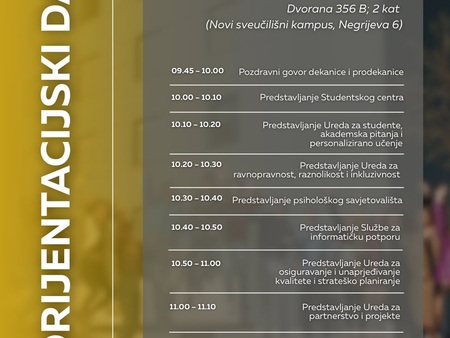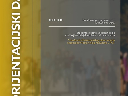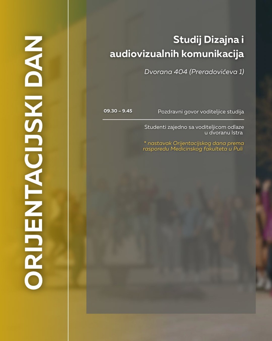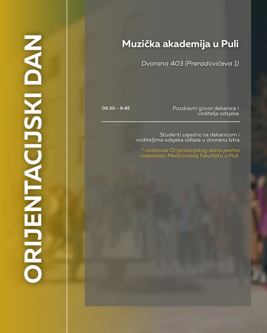 pozivamo vas na Orijentacijski dan Sveučilišta Jurja Dobrile u Puli u ponedjeljak, 6. listopada, koji će se održati na dvije lokacije: Preradovićeva 1 (zgrada FET-a) i Negrijeva 6 (sveučilišni kampus).